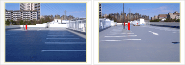 伸び性・強靭性の性質を持つ2種類の防水材を複合することによって車両走行時の耐摩耗性・防滑性に優れています。軟質・硬質ウレタン塗膜防水を複合した工法とウレタン塗膜防水とFRP防水を複合した工法があります。アスファルト防水時に必要となる押えコンクリート層が不要になるので軽量化が図れます。屋上以外にも中層階や地下の駐車場でも採用しています。